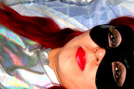 A woman in a black mask with a hint of red. Her expression is serious, and she is looking directly at the camera.