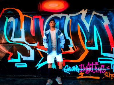 Portrait of a young man in a vibrant urban setting, posing confidently in front of graffiti. He sports a casual outfit with a sporty vibe and is crouched on the ground, facing the camera.