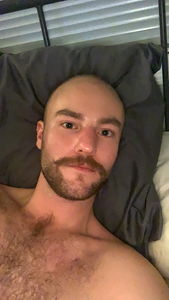 The image is of a man who appears to be a content creator on the platform OnlyFans. He has styled facial hair, and his headshot displays a confident, smiling demeanor. The setting suggests he is in a bedroom or living space, with a bed visible in the background. The lighting is soft and even, giving the photo a relaxed and inviting atmosphere. The man's pose indicates he might be comfortable with showcasing this image to potential fans on OnlyFans.