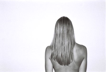 A black and white photograph of Anela, showcasing her long hair and back, taken in front of a plain background.