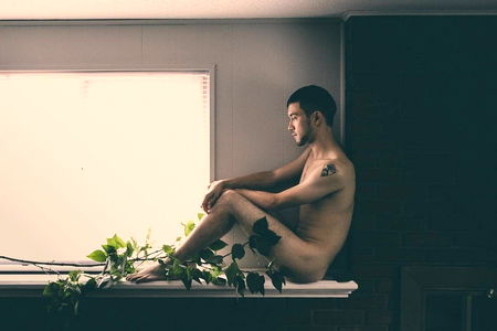 The renowned model and content creator A-Neverland-Panda showcases his athletic physique with a shirtless pose, standing confidently next to a bed. His fit physique is highlighted by the contrast of his dark clothing with the light background. The photo captures his unique style and charisma, making it an appealing piece for fans.