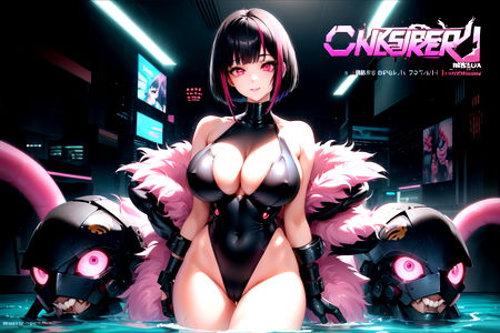 This is a character from an anime-inspired style. She has striking features and is dressed in futuristic attire with a black and white color scheme. Her expression is neutral, and she appears to be posing for the image.