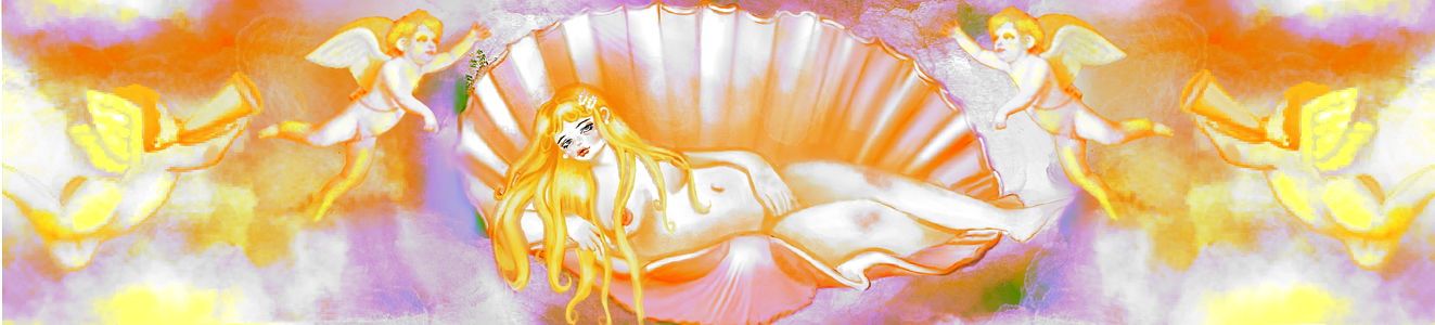 A fantasy-themed digital art image of a woman with voluminous hair, wearing earrings and holding what appears to be a flower or rose, set against an ornate backdrop featuring a psychedelic pattern that blends yellow, green, and purple hues.