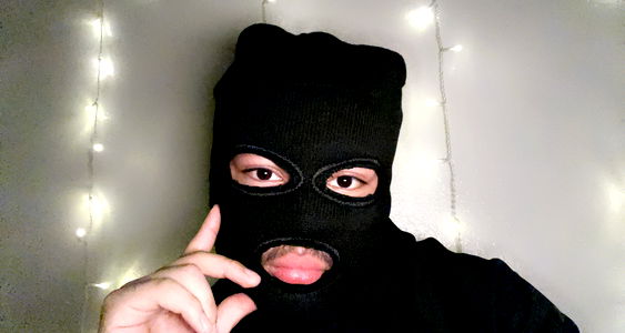 A photo captures the allure of an Onlyfans model, รEngel from Denver, CO, standing in front of a string light backdrop. The individual is clad in a black balaclava, their left hand holding up a peace sign while their right hand is casually resting on the hip. Their pose exudes confidence and intrigue.