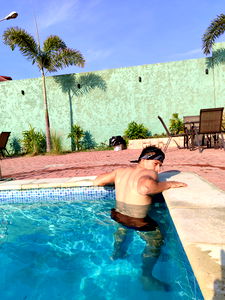 Angel, a popular OnlyFans model, is captured posing in an advertisement for swimwear. He's standing against the backdrop of a brick-paved patio, exuding confidence and style.
