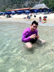 A model posing for a photo in a tropical resort. He is relaxing on the edge of a large blue infinity pool with beautiful ocean views. The clear sky and sunny weather add to the tranquil atmosphere.