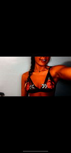 A snapshot of OnlyFans model Angel Banks during a photo shoot. She is wearing a black and red patterned bikini, and there is an iPhone in the corner. Angel Banks appears to be engaged with her phone, which might suggest she is taking or reviewing a selfie. The environment looks like a casual indoor setting, possibly a studio or a home. Her expression is neutral as she interacts with her device.