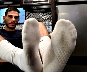 Feet are in a relaxed position, possibly from someone taking a break or resting. The setting seems to be an outdoor environment with a bus visible. Angel Cipriano is the name of the model.
