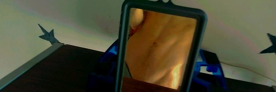 A photograph of an OnlyFans model, possibly taken by a fan. Angel is seen holding a tablet with their profile on the screen. The image appears to be from a bedroom setting.