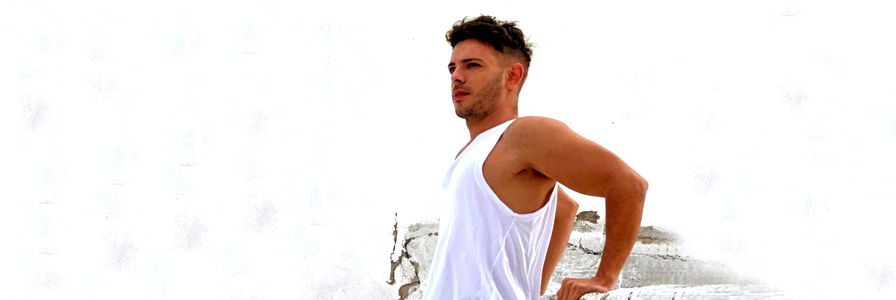 A young adult male with a toned physique, captured in an outdoor setting. He is shirtless and confident, showcasing his fitness and style.