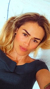 A striking model photo with the individual posing for the camera. She is wearing a light beige top and has a tattoo on her arm, which adds to her unique style. The background is neutral, focusing attention on the model.