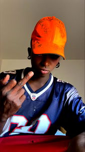 A man wearing an orange hat with a sports jersey and making the middle finger gesture is shown. He appears to be indoors, possibly taking a selfie or recording a reaction. The background is neutral with a white wall. OnlyFans model name is Ange. The image has a casual vibe.