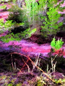 This image captures an abandoned area, likely a park or woodland, with vibrant colors reflecting off the surfaces. It evokes a sense of mystery and quiet, as if untouched for years. The vivid hues suggest that the photo was taken in the early morning or late afternoon when sunlight casts rich shadows and highlights.