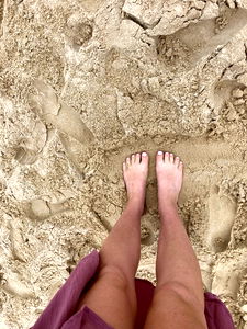 Angel Feet enjoying a relaxing day at the beach, her bare feet in the soft sand. The image captures a moment of tranquility and leisure, with the clear sky and ocean in the background. She's wearing her favorite pair of sunglasses and has a refreshing drink next to her. Perfect for summer! ๐๏ธ๐ #AngelFeet #BeachVibes