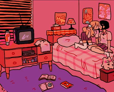 This illustration captures a warm, intimate moment between two characters in a bedroom. The room is comfortably furnished with various personal items and decorations, adding to the homely atmosphere. The creator of this image, Angelfishqueen from Onlyfans, has chosen this scene as a representation of their unique style. Please note that due to the nature of the content, it's important to approach and discuss this imagery with discretion and respect for its context.