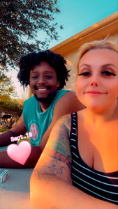 The image shows two individuals, a woman and a man, enjoying some time together in an outdoor setting. They are seated closely to each other, creating a sense of camaraderie and shared experience. The woman appears to be in her mid to late twenties, while the man is older than the woman. Their attire suggests a casual and relaxed environment. Given the unique pose they have adopted with their arms crossed over the table, it seems like a special moment being captured. The background indicates an urban or suburban setting, with clear skies suggesting good weather for outdoor activities.