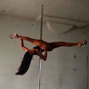 Mecca, a beautiful pole dance performer captured mid-performance in a studio setting. She is an OnlyFans model known for her athletic physique and sensual dance moves.