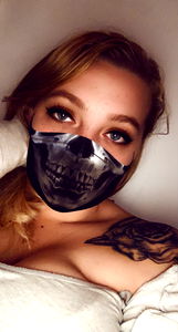 An exclusive OnlyFans photoshoot of the Maryland-based model Angelina, showcasing her sultry and stylish persona. She is seen in a bold black face mask with chic white and gold makeup accents. Her pose radiates confidence and allure. Caught in a candid moment with tattooed biceps subtly hinting at her edgy style, Angelina invites viewers into her world.