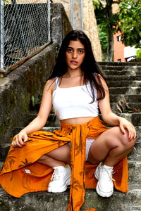 A beautiful young woman, Angelina69, poses confidently on a staircase in an orange dress and white sneakers. She's set against a backdrop of a concrete wall and fence. OnlyFans model name is Angelina69, from: Colombia. She showcases her outfit which includes a white tank top with an oversized fit, paired with an orange dress that flows down to the ground.