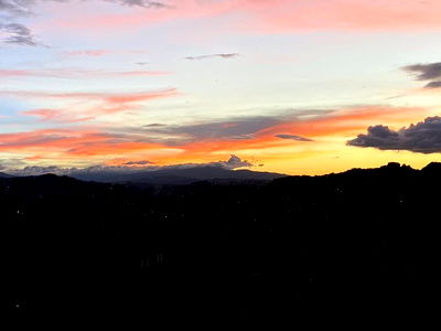 A breathtaking sunset scene captures the essence of a city's energy against the backdrop of nature. The sky, painted with hues of pink and orange, contrasts beautifully with the urban landscape.