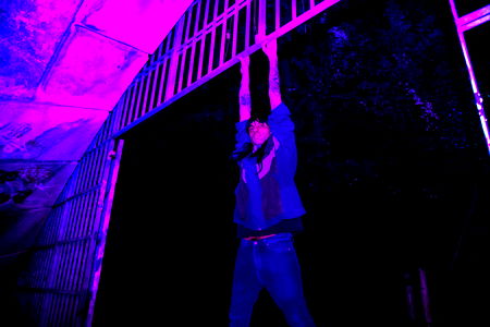 Professional model posing against a concrete backdrop. Wearing a colorful jacket and sporting long hair, he stands confidently with his arms crossed.