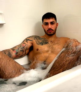 In the image, we see a muscular OnlyFans model known as Angelo. He is currently in Florida, where he spends his time building and showcasing his physique. Here, we see him taking a break with a seductive gaze, lying on a bed with his tattoos on full display.