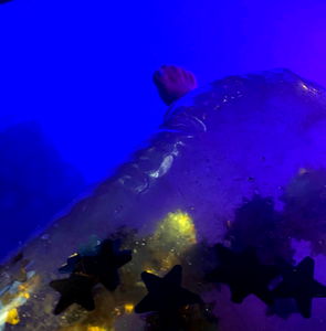 This image features an intricately crafted Christmas tree made out of ice. It is beautifully decorated with a star on top and adorned with tiny stars, creating a charming winter scene. The clear ice makes the details inside visible, adding a touch of whimsy to the festive decoration.