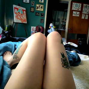 A young woman with tattoos and piercings showcasing her lingerie in a bedroom. She is posing for the camera with confidence. Her tattoos add to her unique style. She seems to be enjoying her time as an influencer.