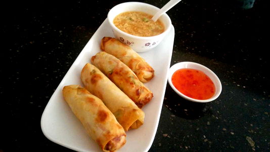The image showcases a table with a meal that includes two plates of food, one containing soup and the other with what appears to be a pastry dish. The dishes are well presented on white plates, accompanied by a small bowl of sauce.
