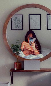 This image features Angel, an OnlyFans model. She is captured in a moment of relaxation on a bed, with her phone in hand. Dressed casually, she stands confidently in front of the mirror, showcasing her unique style and personal brand. Her long hair cascades down, adding to her allure. The room around her appears cozy and inviting, hinting at the intimacy that can be found on OnlyFans.