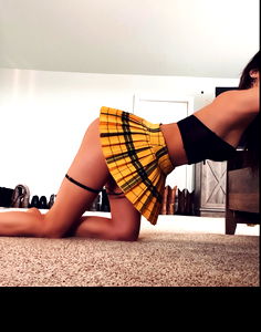Angie is an OnlyFans model from Reno, Nevada. She is seen in the image in a skirt and bra, exuding confidence. With her gaze directed downwards, she appears to be either looking at her own skirt or perhaps lost in thought.