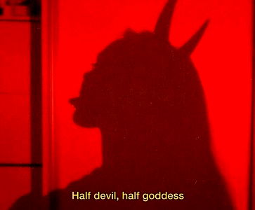 An OnlyFans model exuding confidence with a striking red lingerie set, showcasing her body and unique style. She's poised against a dark background, wearing only the bra for an intimate reveal. The vibrant red contrasts beautifully with her surroundings.