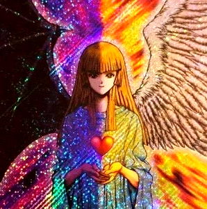 A stylized anime-inspired art piece featuring an angelic character holding a heart. The background has colorful, abstract swirls and streaks, creating a vibrant and ethereal feel. AnimeLord69 is the creator of this artwork. This image may appeal to fans of anime, manga, and fantasy art.