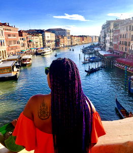 Anirak Worldwide model enjoying a vibrant gondola ride in the picturesque Venice, Italy. She is adorned with a multicolored rainbow scarf and holds onto the edge of the boat. The scene captures the quintessential Venetian experience with buildings and gondolas lining both sides of the canal.