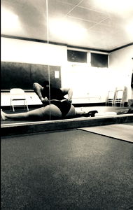 Anjanay Ma, a fitness model, showcases her strength and flexibility in a yoga pose. She is bending forward on a gym floor with a focus on the deep breathing aspect of the pose.