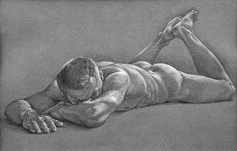 This image is a grayscale illustration of a bodybuilder named Anker. He is depicted lying on his side, embodying the classic aesthetic of traditional art. The composition emphasizes his muscular physique and the intricate details of the muscles and the play of light and shadow.