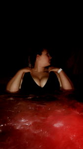 A young woman is captured in a pool at night. She wears a swimsuit and stands near the edge of the water, posing for the camera with a relaxed smile.