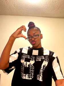 Anna is seen expressing affection, with her fingers creating a heart shape. Her attire is casual, sporting a black and white top with a playful touch of a pink hair accessory.