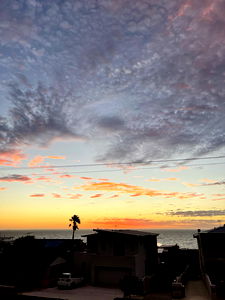 This image captures the tranquil beauty of a sunset, with warm hues casting long shadows in a residential neighborhood. The sky is painted with vibrant colors and clouds that add depth to the scene. The sun's rays illuminate the silhouettes of palm trees and buildings, creating a serene atmosphere.