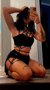 This image features Anna Myers, an OnlyFans model, posing confidently in a lingerie set. Her attire is styled with a black top and fishnet stockings, adding a touch of mystery to her appearance. Anna is captured in the midst of taking a selfie with her phone, showcasing her style and confidence.