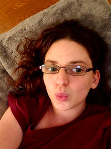 A relaxed, casual selfie in the style of a social media influencer. The woman is seen wearing glasses and lipstick, with her hair falling over her shoulder. She has a warm smile on her face, suggesting a positive mood or connection with the viewer.
