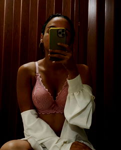 Anne, an OnlyFans model, captured a selfie using the mirror in a dressing room. She's wearing a lace bra and is holding her phone with her left hand. The dressing room appears to be made of wood paneling.