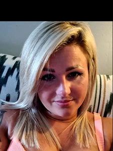 Annesia, a 26-year-old female, shares a selfie with her tattoo. She's wearing an orange top and has long blonde hair. Her inkling is visible on her arm. She's smiling at the camera, showcasing her unique style and personality. The background is blurred but appears to be an indoor setting, possibly a living room or studio.