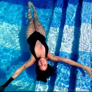 This image captures the alluring model Annie, taking a moment to unwind in an infinity pool overlooking an ocean view. The azure water of the pool mirrors the clear blue sky and the vast body of water below, creating a serene atmosphere. Annie's attire, a swimsuit with a plunging neckline, adds a touch of elegance to this tranquil setting. The overall scene conveys a sense of luxury and relaxation.