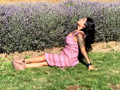 A woman poses for a photograph among sunflowers, enjoying a beverage. She is dressed casually and stands against the backdrop of the vibrant field.