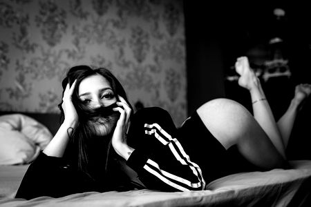 Model wearing a black lingerie set with straps, posing on a bed. She has long hair, sunglasses and her hand is raised to her head. The room has a blue wall.