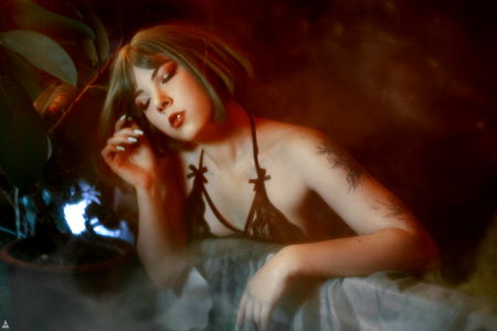AnnLurine, a Russian OnlyFans model, offers an exclusive peek of herself through the leaves of a plant. The image showcases her unique blend of confidence and allure, as she invites viewers into her world.