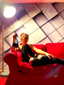 A glamorous model poses for a professional photoshoot, exuding confidence and style. The setting includes a stylish red sofa against a backdrop featuring geometric shapes and an abstract wall. A floor lamp with a shade illuminates the scene, casting soft light on the model. Anny Stuart's pose is characterized by a chic leg-crossed stance, complemented by a striking red dress and black high heels, adding a touch of sophistication to her overall look.
