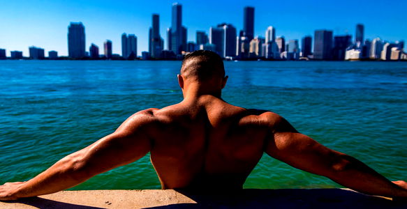 A man is the central figure of this outdoor image, set against the backdrop of a beach and water. He is wearing swimwear, specifically a swim brief, which allows for a clear view of his well-defined physique. His bare chest, along with his muscular abdomen, are prominently displayed. The man's navel is visible, adding to the sense of detail in the image. His undergarment, or swim briefs, are akin to trunks or underpants, yet are designed for the beach setting. There is a slight indication that a swimsuit top might be involved, although it is not clearly visible in the image. The man seems to be at ease in his environment, enjoying a day at the beach. The image captures the essence of a typical beach day, with the focus on the man in his swimwear, ready for a swim or sunbathing by the water. His confident stance and the outdoor setting add to the overall aesthetic of the image.