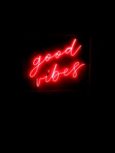 A bright and bold neon sign proclaiming the message 'Good Vibes' in a room with dim lighting, adding a pop of color to the space. The sign is placed against a dark background that contrasts beautifully with the red glow of the neon text.